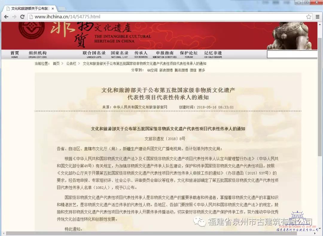 2018年5月16日,國家文化和旅游部公布了第五批國家級非物質文化遺產傳承人名單,我司董事長蔣欽全獲評“閩南傳統民居營造技藝”非遺傳承人。