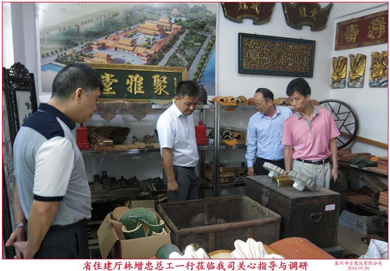 7月29日下午,福建省住建廳林增忠總工等一行蒞臨我司關心指導。首先,在公司董事長蔣欽全、副總李澤平的陪同下,參觀了辦公室及“泉州市閩南傳統民居營造技藝傳習所”展示廳。